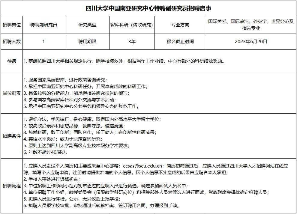 中心以政策研究咨询为主要方向,争取在南亚研究方面当好思想库和智囊团;积极进行国际学术交流,发挥智库的国际影响力,增强我国的话语权;促进与南亚国家的友好合作,树立我国的良好形象;充分利用四川大学的师资力量,培养南亚教学和研究方面的优秀人才。中心正处于上升发展时期,亟需招揽国际政治、国际关系、外交学和世界经济等相关专业的专职科研人员,我们诚邀您的加入!